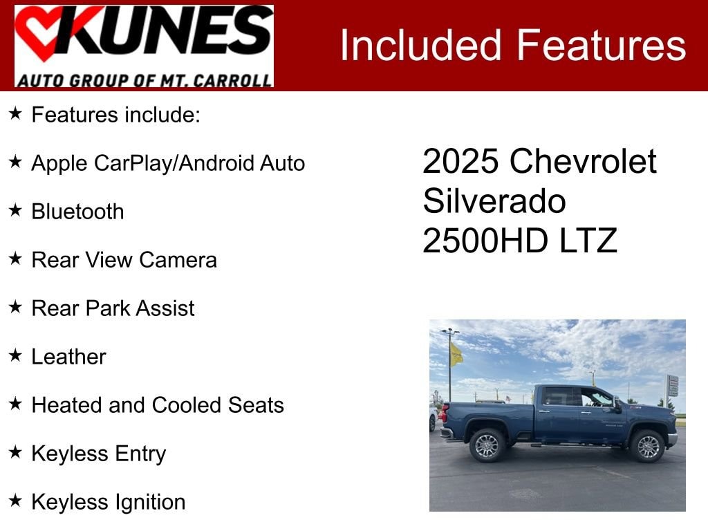 The 2025 Silverado 2500HD can handle any task at work or play. Also included with every new vehicle: LIFETIME NO FEAR WARRANTY and AT HOME COURTESY DELIVERY! Call us for full details! We pride ourselves on honesty and integrity, but please note that mistakes or misprints due to human error are possible. Find out why our dealerships have won DealerRater.com DEALER OF THE YEAR a whopping 10 TIMES! Call, email, or live chat with one of our friendly sales professionals now to schedule your test drive! Prices shown do not include taxes, license, and title fees and a $367.70 documentary service fee. Customer must qualify for advertised rebates. Not responsible for human error. Price includes: $500 - Chevrolet Consumer Cash Program. Exp. 11/03/2025