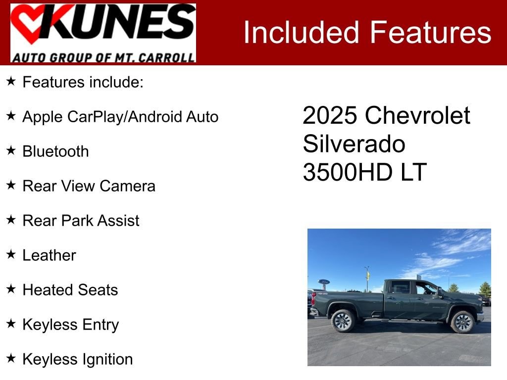 2025 Chevrolet Silverado 3500HD LT Cypress Gray Duramax 6.6L V8 Turbodiesel The 2025 Silverado 3500HD can handle any task at work or play. Also included with every new vehicle: LIFETIME NO FEAR WARRANTY and AT HOME COURTESY DELIVERY! Call us for full details! We pride ourselves on honesty and integrity, but please note that mistakes or misprints due to human error are possible. Find out why our dealerships have won DealerRater.com DEALER OF THE YEAR a whopping 10 TIMES! Call, email, or live chat with one of our friendly sales professionals now to schedule your test drive! Price excludes taxes, license and title fees and a documentary service fee. Customer must qualify for advertised rebates. Not responsible for human error. Price includes: $500 - Chevrolet Consumer Cash Program. Exp. 11/03/2025