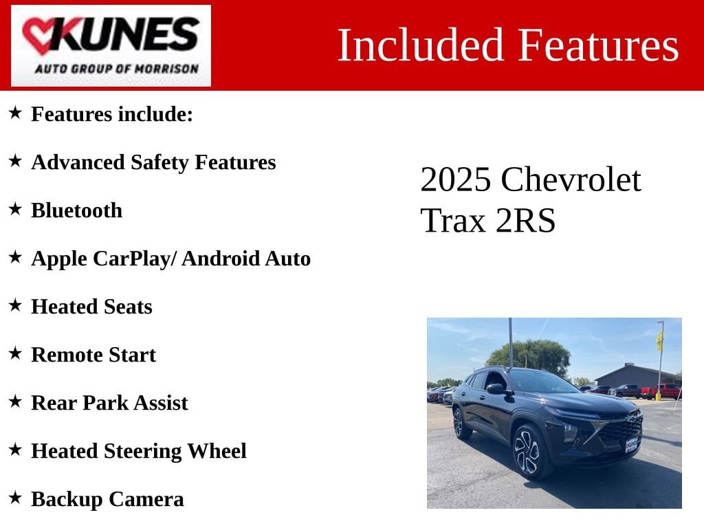 Advanced Safety Features, Bluetooth, Apple CarPlay/ Android Auto, Heated Seats, Remote Start, Rear Park Assist, Heated Steering Wheel, Backup Camera, Trax 2RS, 4D Sport Utility, 1.2L Ecotec Turbo DOHC DI w/VVT, 6-Speed Automatic, FWD, Mosaic Black Metallic, Jet Black With Red Accents Premium Synthetic, Driver Confidence Package, License Plate Front Mounting Package, Preferred Equipment Group 2RS, 2-Way Adjustable Front Head Restraints, 2-Way Power Driver Lumbar Seat Adjuster, 3 Years SiriusXM, 3.50 Final Drive Axle Ratio, 4-Way Manual Front Passenger Seat Adjuster, 4-Wheel Disc Brakes, 6 Speakers, 6-Speaker Audio System Feature, 8-Way Power Driver Seat Adjuster, ABS brakes, Adaptive Cruise Control, Air Conditioning, Alloy wheels, AM/FM radio: SiriusXM, Auto High-beam Headlights, Automatic temperature control, Brake assist, Bumpers: body-color, Compass, Delay-off headlights, Driver door bin, Driver vanity mirror, Dual front impact airbags, Dual front side impact airbags, Electronic Stability Control, Emergency communication system: OnStar One Essentials, Evotex Seat Trim, Exterior Parking Camera Rear, Front & Rear All-Weather Floor Liners (LPO), Front anti-roll bar, Front Bucket Seats, Front Center Armrest, Front reading lights, Front wheel independent suspension, Fully automatic headlights, Heated door mirrors, Heated Driver & Front Passenger Seats, Heated front seats, Heated steering wheel, Illuminated entry, Lane Change Alert w/Side Blind Zone Alert, Leather steering wheel, Low tire pressure warning, Occupant sensing airbag, Outside temperature display, Overhead airbag, Overhead console, Panic alarm, Passenger door bin, Passenger vanity mirror, Power door mirrors, Power steering, Power windows, Premium audio system: Chevrolet Infotainment 3, Radio data system, Radio: AM/FM Stereo Audio System, Rear Cross-Traffic Alert, Rear Park Assist, Rear window defroster, Rear window wiper, Remote keyless entry, Security system, SiriusXM Trial Subscription, Speed control, Split folding rear seat, Spoiler, Sport steering wheel, Steering wheel mounted audio controls, Tachometer, Telescoping steering wheel, Tilt steering wheel, Traction control, Trip computer, Variably intermittent wipers, Wheels: 19 Black-Painted Machined Aluminum, Trax 2RS, 4D Sport Utility, 1.2L Ecotec Turbo DOHC DI w/VVT, 6-Speed Automatic, FWD, Mosaic Black Metallic, Jet Black With Red Accents Premium Synthetic, Driver Confidence Package, License Plate Front Mounting Package, Preferred Equipment Group 2RS. Recent Arrival! 28/32 City/Highway MPG