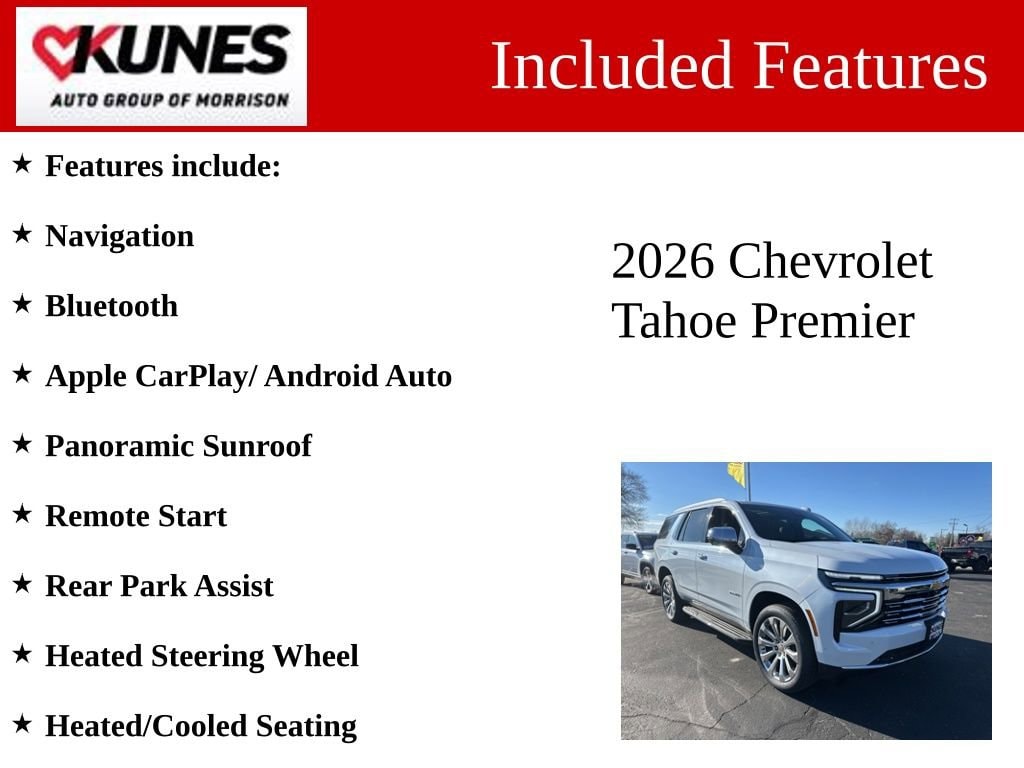 The 2026 Tahoe can carry all the passengers and cargo you need in style and comfort. Also included with every new vehicle: LIFETIME NO FEAR WARRANTY, FIRST OIL CHANGE, and AT HOME COURTESY DELIVERY! Call us for full details! We pride ourselves on honesty and integrity, but please note that mistakes or misprints due to human error are possible. Find out why our dealerships have won DealerRater.com DEALER OF THE YEAR a whopping 10 TIMES! Call, email, or live chat with one of our friendly sales professionals now to schedule your test drive! Prices shown do not include taxes, license, and title fees and a $367.70 documentary service fee.