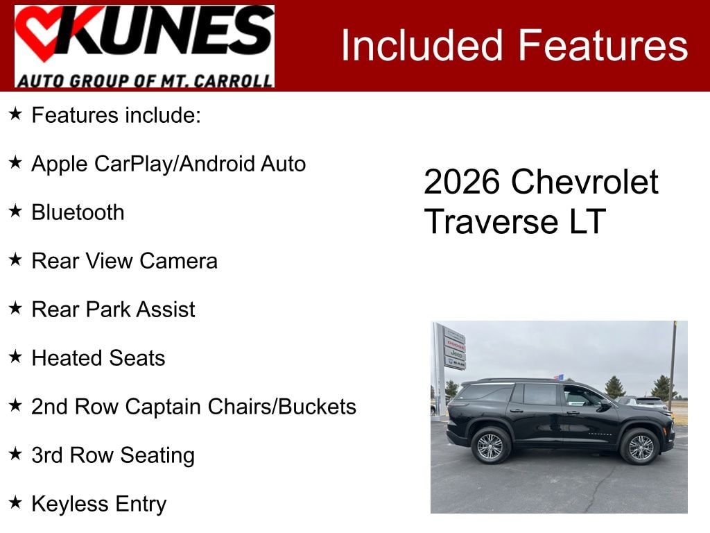 Apple CarPlay/Android Auto, Bluetooth, Rear View Camera, Rear Park Assist, Heated Seats, 2nd Row Captain Chairs/Buckets, 3rd Row Seating, Keyless Entry, Keyless Ignition, Remote Start, Navigation/GPS/NAVI, Sirius/XM, Collision Avoidance, Power Lift Gate, Steering Wheel Controls, Traverse LT 2LT, 4D Sport Utility, 2.5L DOHC, 8-Speed Automatic, AWD, Mosaic Black Metallic, Lt Jet Black Premium Synthetic, Driver Confidence Package, Navigation System, Preferred Equipment Group 2LT, 3rd row seats: split-bench, 4-Way Manual Front Passenger Seat Adjuster, 4-Wheel Disc Brakes, 6 Speakers, 6-Speaker Audio System Feature, 8-Way Power Driver Seat Adjuster, ABS brakes, Air Conditioning, Alloy wheels, AM/FM radio: SiriusXM with 360L, Apple CarPlay/Android Auto, Auto High-beam Headlights, Automatic temperature control, Brake assist, Bumpers: body-color, Child-Seat-Sensing Airbag, Compass, Delay-off headlights, Driver door bin, Driver vanity mirror, Dual front impact airbags, Dual front side impact airbags, Electronic Stability Control, Emergency communication system: OnStar, Four wheel independent suspension, Front anti-roll bar, Front Bucket Seats, Front Center Armrest, Front dual zone A/C, Front reading lights, Fully automatic headlights, HD Surround Vision, Heated door mirrors, Heated Driver and Front Passenger Seats, Heated front seats, Heated steering wheel, Illuminated entry, Key Card, Low tire pressure warning, Occupant sensing airbag, Outside temperature display, Overhead airbag, Overhead console, Panic alarm, Passenger door bin, Passenger vanity mirror, Power door mirrors, Power driver seat, Power Liftgate, Power Outlet, Power steering, Power windows, Premium Cloth Seat Trim, Radio data system, Radio: : Audio System w/17.7 Diagonal Display, Rear air conditioning, Rear anti-roll bar, Rear Camera Mirror, Rear Pedestrian Alert, Rear reading lights, Rear window defroster, Rear window wiper, Remote keyless entry, Security system, SiriusXM with 360L Trial Subscription, Speed control, Speed-sensing steering, Spoiler, Steering wheel mounted audio controls, Tachometer, Telescoping steering wheel, Tilt steering wheel, Traction control, Traffic Sign Recognition, Trip computer, Turn signal indicator mirrors, Variably intermittent wipers, Voltmeter, Wheels: 18 Grazen Metallic Machined-Face Aluminum, Traverse LT 2LT, 4D Sport Utility, 2.5L DOHC, 8-Speed Automatic, AWD, Mosaic Black Metallic, Lt Jet Black Premium Synthetic, Driver Confidence Package, Navigation System, Preferred Equipment Group 2LT. 2026 Chevrolet Traverse LT 2LT Mosaic Black Metallic 2.5L DOHC