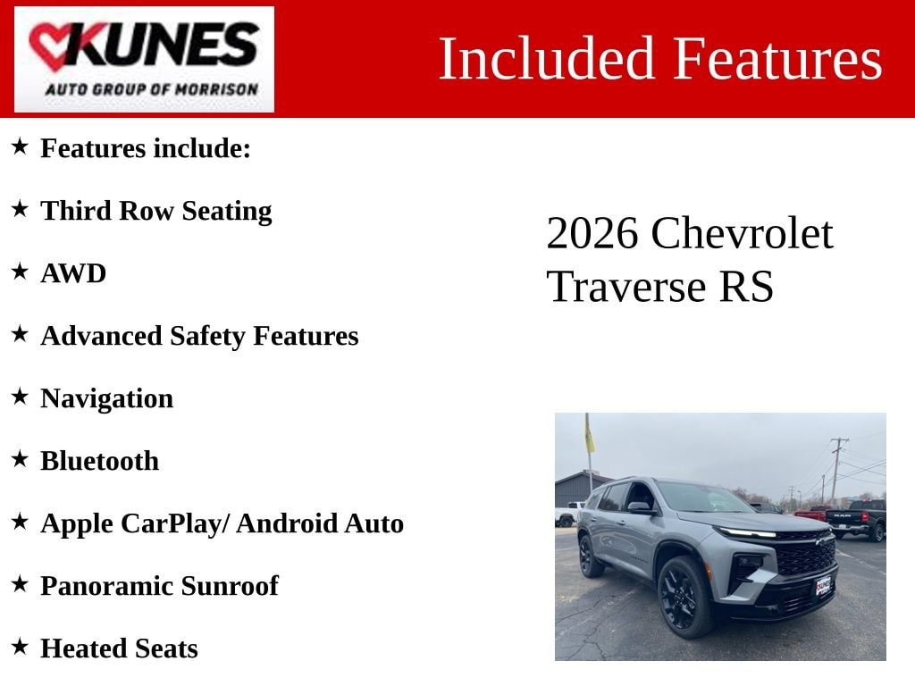 Sterling Gray Metallic 2026 Chevrolet Traverse RS Features include:, Third Row Seating, AWD, Advanced Safety Features, Navigation, Bluetooth, Apple CarPlay/ Android Auto, Panoramic Sunroof, Heated Seats, Remote Start, Rear Park Assist, Heated Steering Wheel, Backup Camera, 2nd Row Captain Seats, Traverse RS, 4D Sport Utility, 2.5L DOHC, 8-Speed Automatic, AWD, Sterling Gray Metallic, Rs Jet Black With Torch Red Accents Leather, Floor Liner Package, Navigation System, Preferred Equipment Group 2RS.