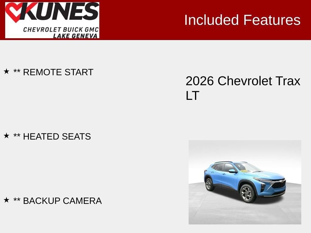 Whether you're looking for a versatile daily driver or a capable companion for your weekend adventures, the 2026 Chevrolet Trax LT is an exceptional choice. Experience the perfect blend of style, technology, and efficiency by visiting our showroom and taking this impressive SUV for a test drive. We're confident you'll be impressed by its exceptional value and the seamless ownership experience it provides. Price includes: $500 - Chevrolet GM Financial APR & NCC Consumer Cash Program: $500 discount and 5.69% APR for 36 months. $30.28 per $1000 financed. Available to well qualified buyers who finance through GM Financial. XGQ, NCC. Exp. 03/02/2026 $500 - GM Rewards Card Sales Sign Up and Spend Offer. Exp. 06/30/2026 This rebate is only available if you also take the 'Chevrolet GM Financial APR & NCC Consumer Cash Program: $500 discount and 5.69% APR for 36 months' rebate. $500 - Chevrolet GMF Bonus Cash Program. Exp. 03/02/2026