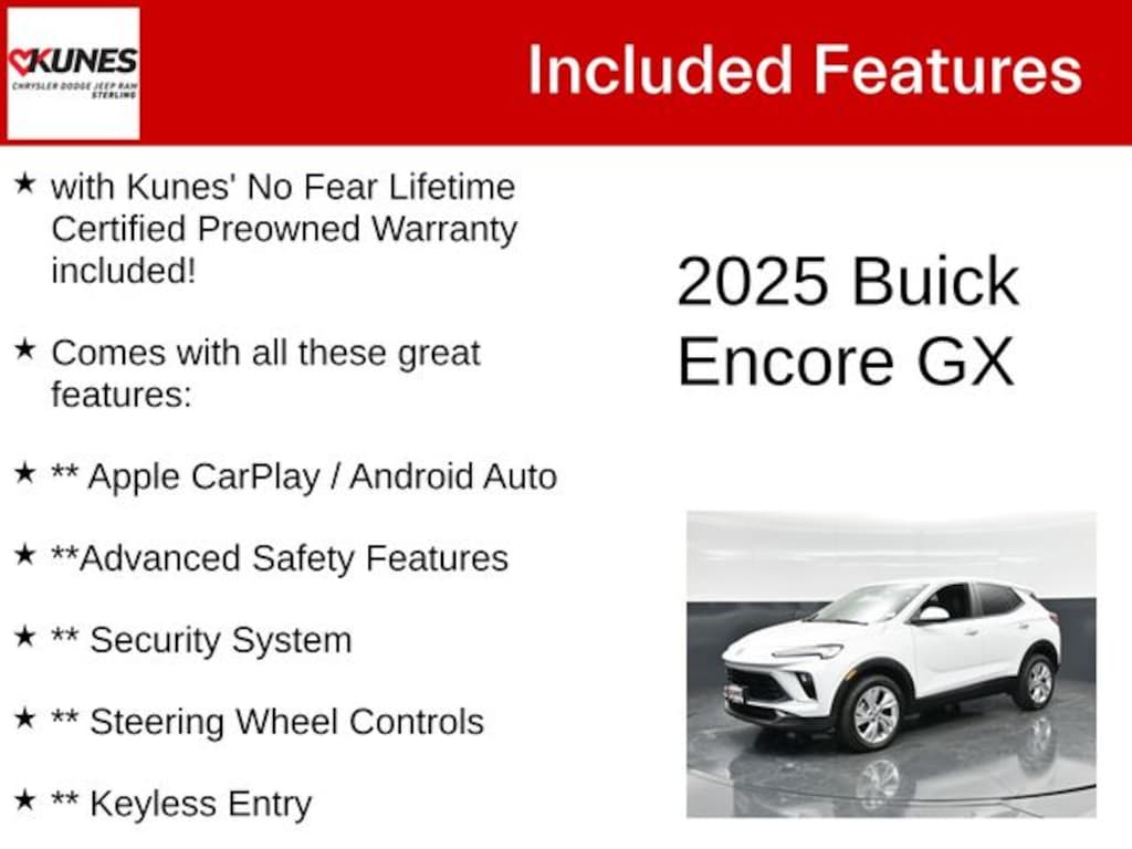 Summit White 2025 Buick Encore GX Preferred Preferred with Kunes' No Fear Lifetime Certified Preowned Warranty included!, Comes with all these great features:, ** Apple CarPlay / Android Auto, **Advanced Safety Features, ** Security System, ** Steering Wheel Controls, ** Keyless Entry, ** Automatic Headlights, ** Bluetooth, ** Back up Camera, **SIRIUS XM, Remote Start, 4-Way Manual Passenger Seat Adjuster, 7 Speakers, Delay-off headlights, Enhanced Performance 7-Speaker System w/Amplifier, Front Bucket Seats, Front Center Armrest, Front reading lights, Front wheel independent suspension, Overhead console, Passenger door bin, Rear reading lights, Rear window wiper, Ride & Handling Suspension, SiriusXM Trial Subscription, Speed-sensing steering, Split folding rear seat, Spoiler, Telescoping steering wheel. Recent Arrival!