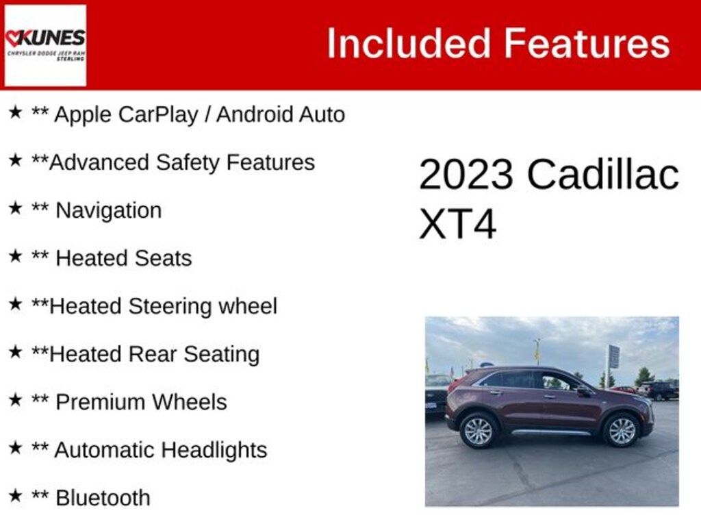Needed a small SUV, but did not want to buy foreign, even though some are built in US, had very bad experience with BMW, never again. Considered the Cadillac XT5, but when we say the XT4, it was exactly what we wanted. First, the style of the car is simple but the waterfall lights front and back really add still, the overall shape flows evenly and allows efficient us of space for the interior. I am six foot one, and very comfortable, my wife is 5 foot 1 and she is very comfortable. Accessories are just enough for us, we really don't care too much for advanced cutting edge electronics, the XT4 has very modern accessories without going over the edge. The video unit is very clear, and very easy to see with no glare, push button controls clearly defined and easy to use. Seats are very nice. Many thoughtful configurations for driver access and views. The ride is QUIET, SMOOTH, and this car is so easy to drive. My wife did not want to buy an SUV because she does not like large cars, she loves driving this car. Driver's visibility is excellent from back to front. Interior is GM, not over luxurious, but did I mention comfortable. We own the Premiere Luxury Model, because we wanted the safety features, of the collision, lane departure, and backup warnings. There is more than enough storage space, especially when the seats fold down. Although only a four cylinder engine with Turbo, this is no lag, runs very quiet, and smooth. Simply put, bust car we purchased in years, we love to drive this car, and enjoy our ride. It is truly a Cadillac and we love it so much. Highly recommend the XT4. You will like it, I am sure, fyi I get about 28 MPG, combine city and highway, only got 795 miles on it.… - 5.0