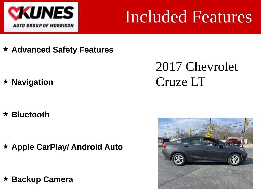 2017 Chevrolet Cruze LT Tungsten Metallic FWD 1.4L 4-Cylinder Turbo DOHC CVVTRecent Arrival! Clean CARFAX. RS Package with fog lamps and rear spoiler Sport body kit with RS badging 16-inch aluminum wheels Back-up camera for easy reversing Navigation via onboard telematics Apple CarPlay, Bluetooth, and WiFi hotspot connectivity Heated, power-adjustable side mirrors Cruise control Keyless entry and power door locks Remote trunk release Satellite radio and MP3 audio input Rear air ducts and floor-mounted air vents Dual vanity mirrors and front reading lamps Tire pressure monitoring system Stability control and traction control Full airbag suite including front, side, and knee airbags 1.4L turbocharged engine with 6-speed automatic transmission Automatic headlights and daytime running lights Power steering and 4-wheel anti-lock disc brakes
