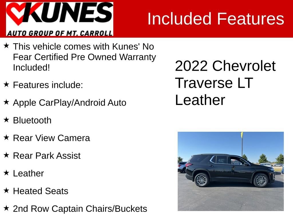 Mosaic Black Metallic 2022 Chevrolet Traverse LT Leather Certified. Certification Program Details:** NO FEAR LIFETIME CERTIFIED PREOWNED **Over $2,895 of value at no cost!*LIFETIME WARRANTY!*3 Day Exchange Policy!*Complimentary powertrain warranty with ability to upgrade to fully comprehensive coverage and/or extend up to 125,000 miles!*125+ Point Inspection by our factory trained ASE Certified technicians and reconditioned to the highest standards.*Complimentary AutoCheck History Report*Complimentary AutoCheck Buyback Protection*Financing for Everyone - Guaranteed credit approval regardless of credit history!*Over 30 lenders who compete to get you the best financing terms*No payments for up to 90 days!*Weekly, Bi-Weekly, and Monthly Payment Options for all buyers!*First Free Oil Change!*Trade anytime policy - cars, trucks, boats, RVs, motorcycles - as long as we donât have to feed it, you can trade it!This vehicle comes with Kunes' No Fear Certified Pre Owned Warranty Included!, Features include:, Apple CarPlay/Android Auto, Bluetooth, Rear View Camera, Rear Park Assist, Leather, Heated Seats, 2nd Row Captain Chairs/Buckets, 3rd Row Seating, Keyless Entry, Keyless Ignition, Remote Start, Sirius/XM, Collision Avoidance, Tow Package, Power Lift Gate, Steering Wheel Controls, Traverse LT Leather, 4D Sport Utility, AWD, Mosaic Black Metallic, Black Leather, Front License Plate Bracket Mounting Package, Preferred Equipment Group 3LT, Trailering Equipment.Put down that mouse and unplug your Internet because your search for the perfect SUV is OVER! This terrific Chevrolet Traverse can carry all the passengers and cargo you need in style and comfort. It's just as nice as you'll find for the year and mileage! Come check it out today! Find out why our dealerships have won DealerRater.com DEALER OF THE YEAR a whopping 10 TIMES! Call, email, or live chat with one of our friendly sales professionals now to schedule your test drive! Prices shown do not include taxes, license, and title fees and a $367.70 documentary service fee.3.6L V6 SIDI VVT 9-Speed Automatic AWD