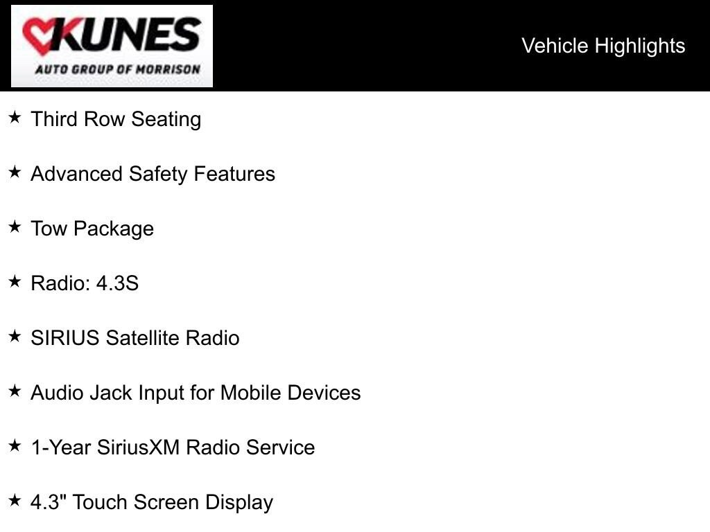 Flexible Seating Group with 3rd row seat, 2nd row and rear head air bags, pass-through rear seat Quick Order Package 22F for added equipment Aluminum wheels Temporary spare tire AM/FM radio, CD player, MP3 player, satellite radio Rear defrost and privacy glass Automatic headlights and daytime running lights Front and rear all-season tires Adjustable steering wheel 4.3 touch screen display Keyless entry and keyless start Multi-zone air conditioning Cruise control Heated mirrors and power mirrors Power windows and power door locks Steering wheel audio controls Cruise control Bucket seats and cloth seats Child safety locks Traction control and stability control Multiple airbags including driver, passenger, front head, rear head, front side, and knee airbags Towing equipment