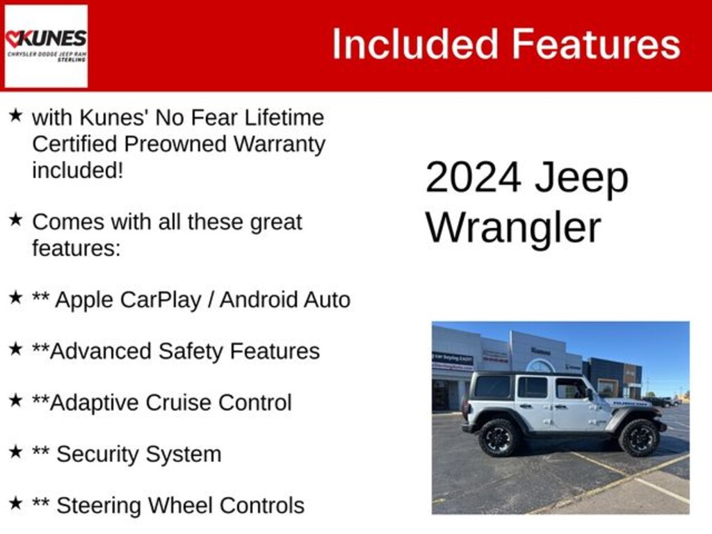 Silver Zynith Clearcoat 2024 Jeep Wrangler Rubicon 4xe Rubicon 4xe with Kunes' No Fear Lifetime Certified Preowned Warranty included!