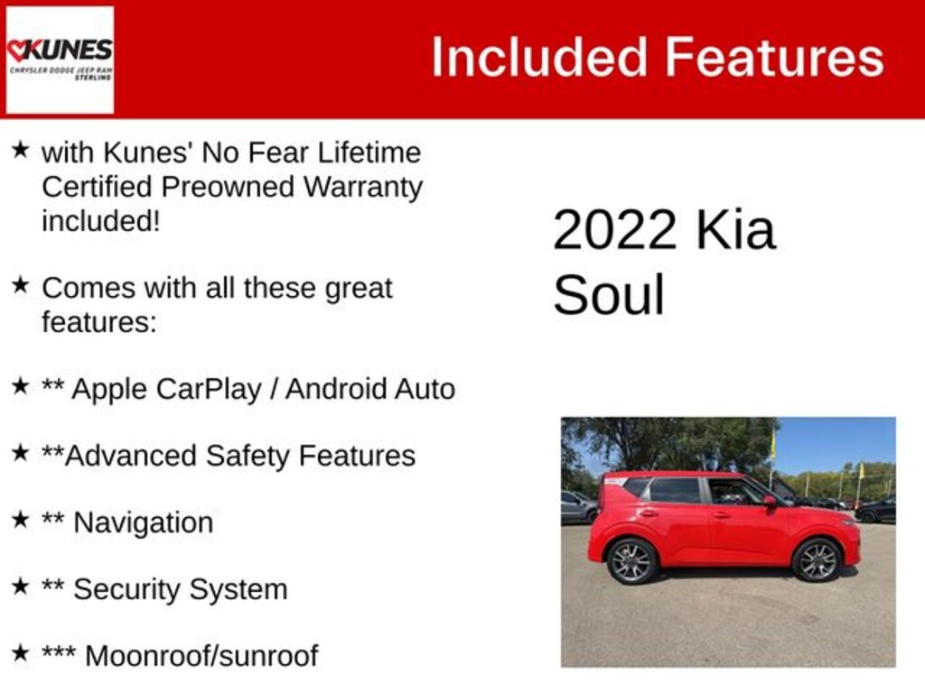 Inferno Red 2022 Kia Soul GT-Line GT-Line with Kunes' No Fear Lifetime Certified Preowned Warranty included!, Comes with all these great features:, ** Apple CarPlay / Android Auto, **Advanced Safety Features, ** Navigation, ** Security System, *** Moonroof/sunroof, ** Steering Wheel Controls, ** Premium Wheels, ** Keyless Entry, ** Automatic Headlights, ** Bluetooth, ** Back up Camera, **SIRIUS XM, Power moonroof. Recent Arrival!