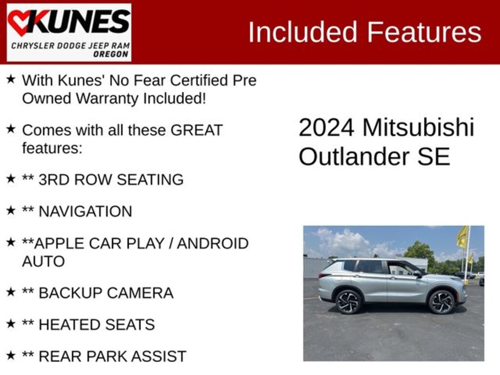 With Kunes' No Fear Certified Pre Owned Warranty Included!, Comes with all these GREAT features:, ** 3RD ROW SEATING, ** NAVIGATION, **APPLE CAR PLAY / ANDROID AUTO, ** BACKUP CAMERA, ** HEATED SEATS, ** REAR PARK ASSIST, ** SIRIUSXM SATELLITE RADIO, ** BLUETOOTH, Outlander SE, 4D Sport Utility, 4WD, Alloy Silver Metallic, ABS brakes, Active Cruise Control, Alloy wheels, Electronic Stability Control, Front dual zone A/C, Heated door mirrors, Heated Front Bucket Seats, Heated front seats, Illuminated entry, Low tire pressure warning, Navigation System, Power Liftgate, Remote keyless entry, Traction control.