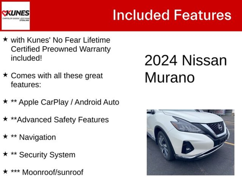 Pearl White 2024 Nissan Murano SL SL with Kunes' No Fear Lifetime Certified Preowned Warranty included!, Comes with all these great features:, ** Apple CarPlay / Android Auto, **Advanced Safety Features, ** Navigation, ** Security System, *** Moonroof/sunroof, **Panoramic Sunroof, ** Heated Seats, **Heated Steering wheel, **Heated Rear Seating, ** Steering Wheel Controls, ** Premium Wheels, ** Keyless Entry, ** Automatic Headlights, ** Bluetooth, ** Back up Camera, **Rear Park Assist, **SIRIUS XM, Remote Start, 11 Speakers, 4.667 Axle Ratio, AM/FM radio: SiriusXM, AM/FM/CD/MP3/WMA Audio System, CD PLAYER, Navigation system: NissanConnect with Navigation and Services, Radio data system, Wheels: 20" Machined Aluminum-Alloy. Recent Arrival!