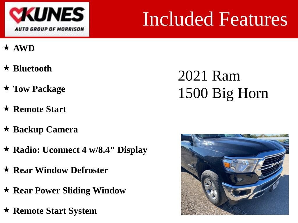 Big Horn Level 1 Equipment Group: heated mirrors, power driver seat, Bluetooth, tow hitch, power folding mirrors, satellite radio, rear defrost, universal garage door opener