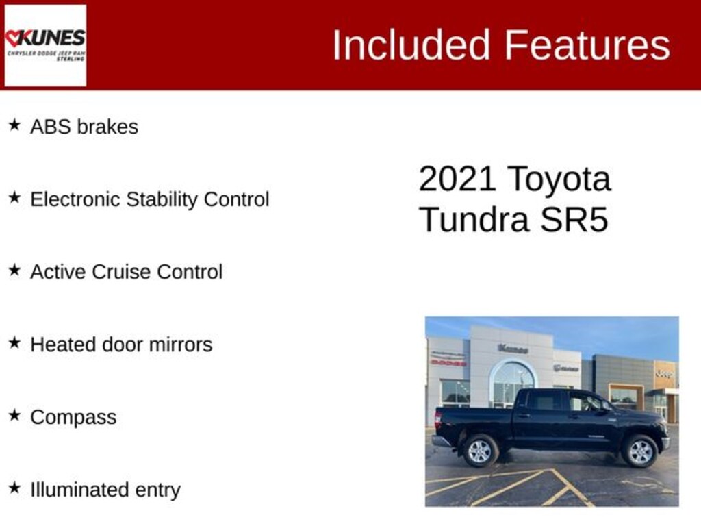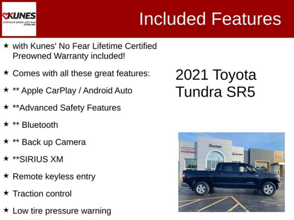 Black 2021 Toyota Tundra SR5 SR5 with Kunes' No Fear Lifetime Certified Preowned Warranty included!, Comes with all these great features:, ** Apple CarPlay / Android Auto, **Advanced Safety Features, ** Bluetooth, ** Back up Camera, **SIRIUS XM, Tundra SR5, 4D CrewMax, i-Force 5.7L V8 DOHC 32V LEV, 4WD, Black, ABS brakes, Active Cruise Control, Compass, Electronic Stability Control, Heated door mirrors, Illuminated entry, Low tire pressure warning, Remote keyless entry, Traction control.