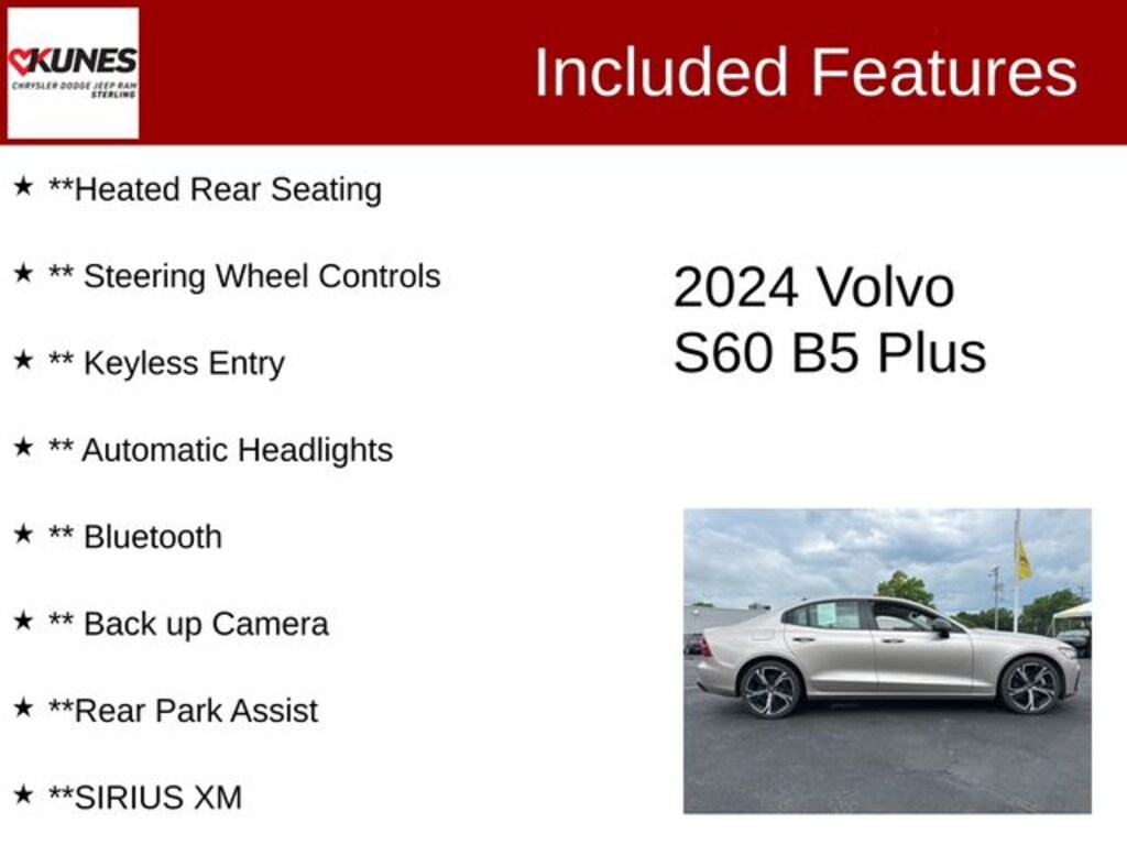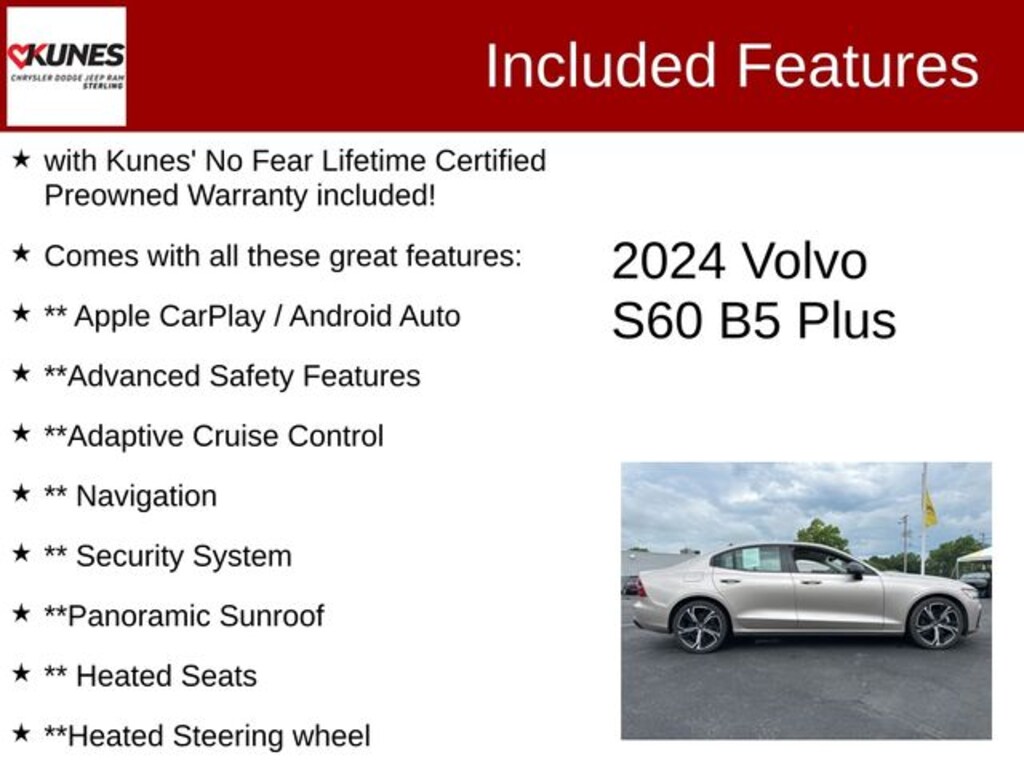 Beige 2024 Volvo S60 B5 Plus Dark Theme B5 Plus Dark Theme with Kunes' No Fear Lifetime Certified Preowned Warranty included!, Comes with all these great features:, ** Apple CarPlay / Android Auto, **Advanced Safety Features, **Adaptive Cruise Control, ** Navigation, ** Security System, **Panoramic Sunroof, ** Heated Seats, **Heated Steering wheel, **Heated Rear Seating, ** Steering Wheel Controls, ** Keyless Entry, ** Automatic Headlights, ** Bluetooth, ** Back up Camera, **Rear Park Assist, **SIRIUS XM.